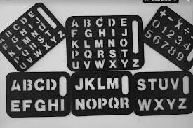 Set of black vinyl stickers with white uppercase alphabet letters, numbers, and symbols, arranged in lines.